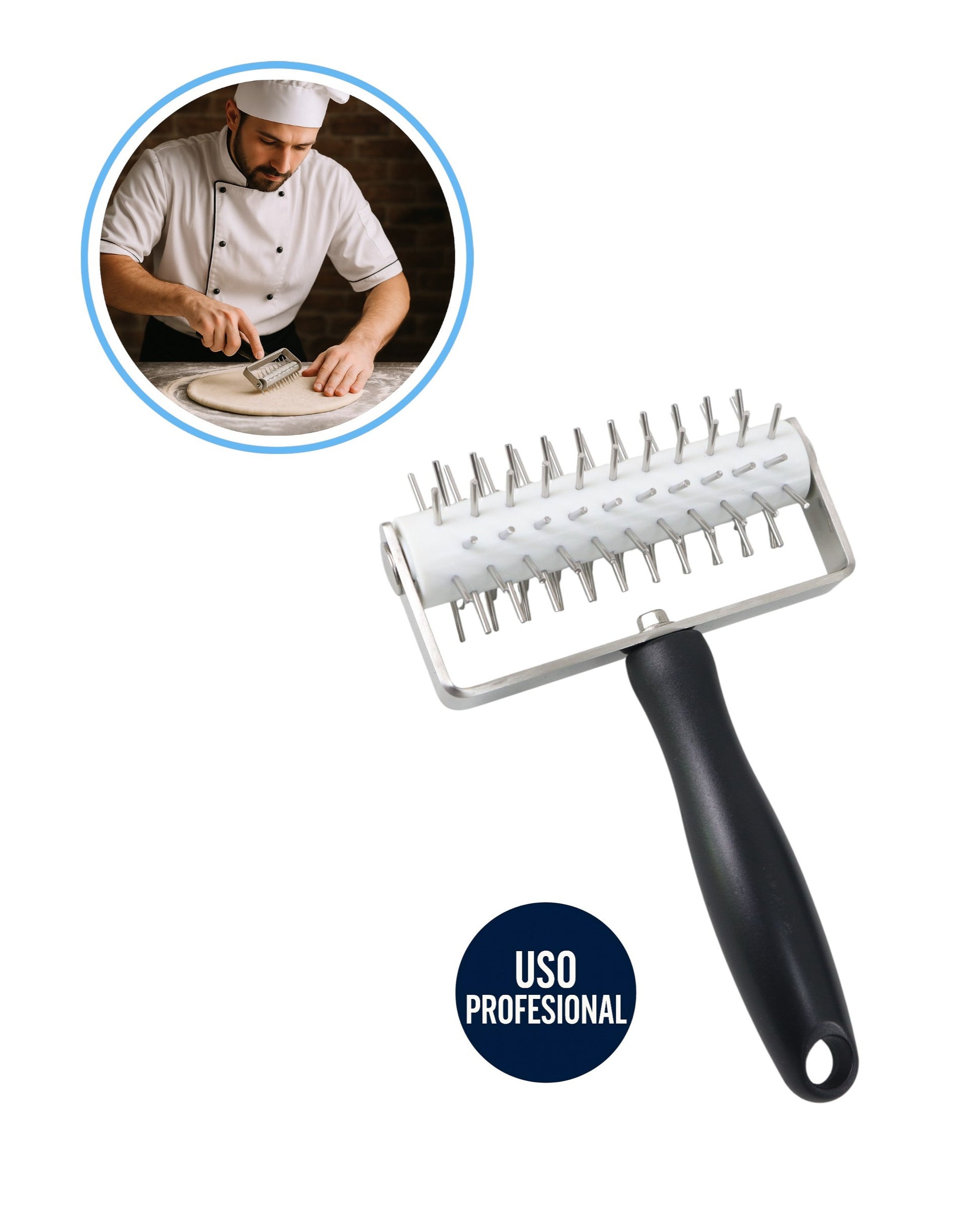 Fabricado en acero inoxidable de grado alimenticio y plástico resistente, es duradero, ergonómico y apto para lavavajillas. Su diseño profesional ofrece un agarre cómodo que permite perforar la masa con rapidez y sin esfuerzo.